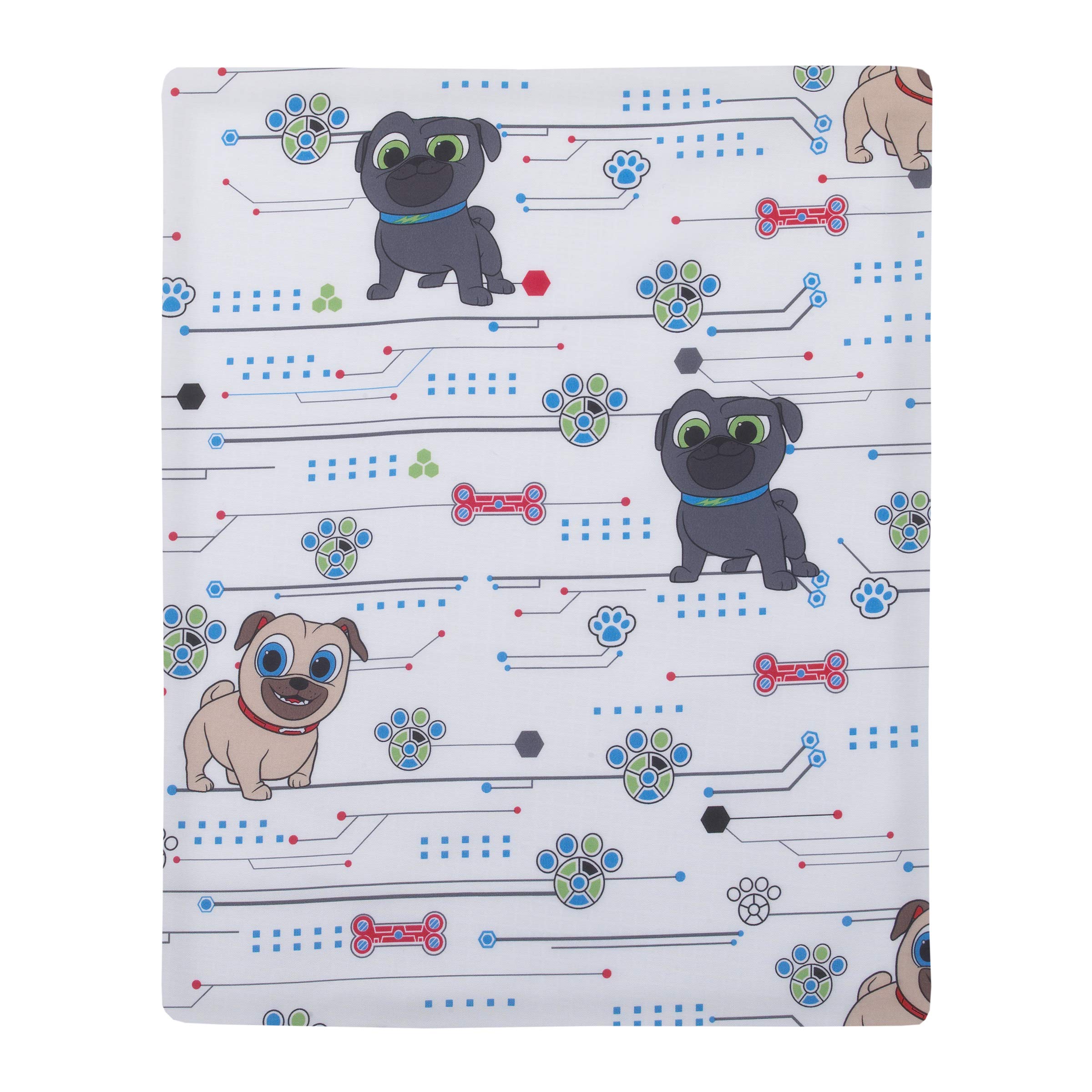 Disney Puppy Dog Pals - Puppy Pal Fun - 4Piece Toddler Bed Set - Coral Fleece Toddler Blanket, Fitted Bottom Sheet, Flat Top Sheet, Standard Size Pillowcase, Blue, Red, Gray, Tan