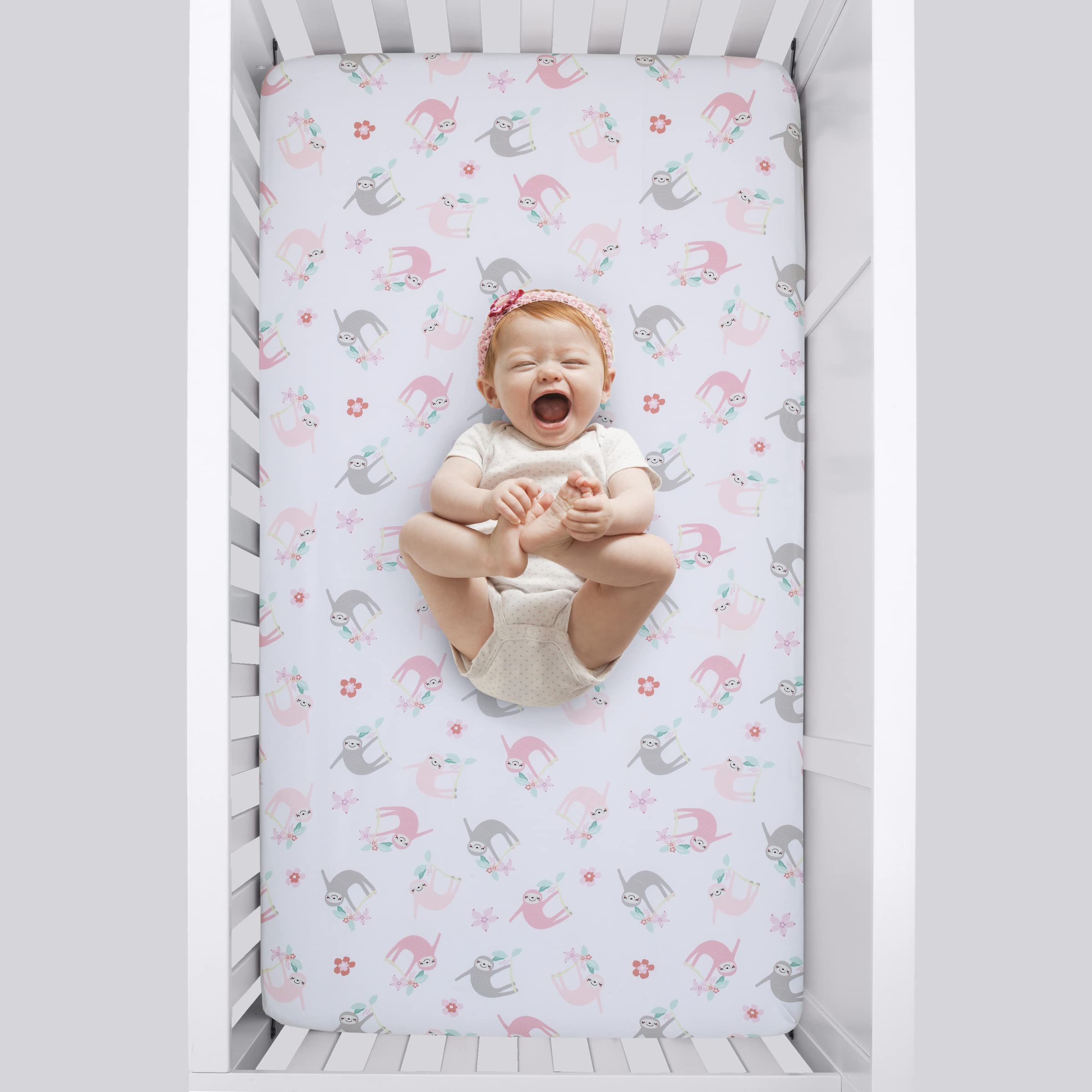 Little Love by NoJo Tropical Garden Pink, Grey, and White Sloth Super Soft Fitted Crib Sheet