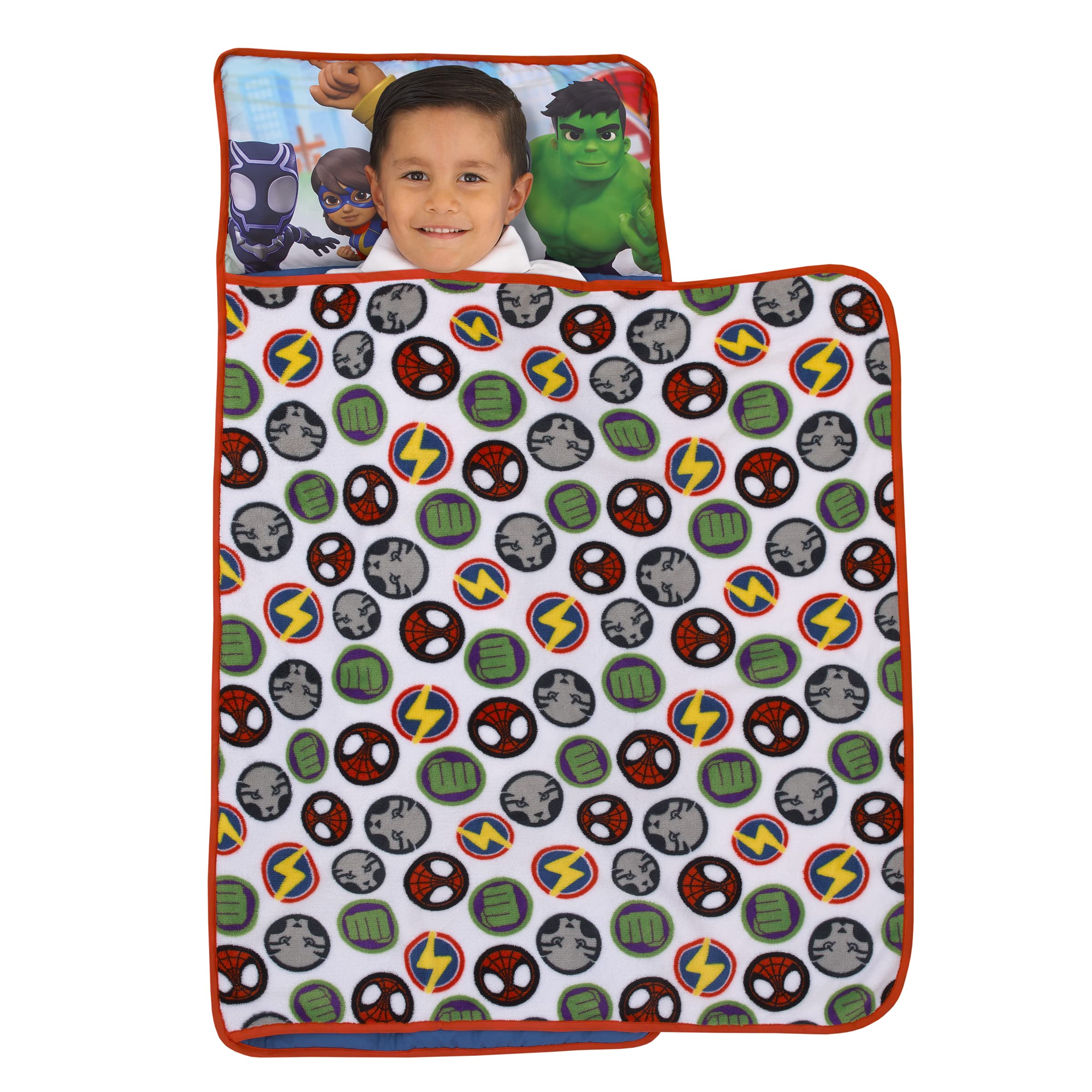 - Spidey Team Up Toddler Nap Mat features an action-packed pattern in bold shades of blue, red, yellow and green